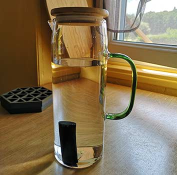 Le charbon actif Binchotan Kishu utilisé dans une carafe peut, selon les bâtons, flotter au début puis finir par couler après quelques heures dans l’eau.